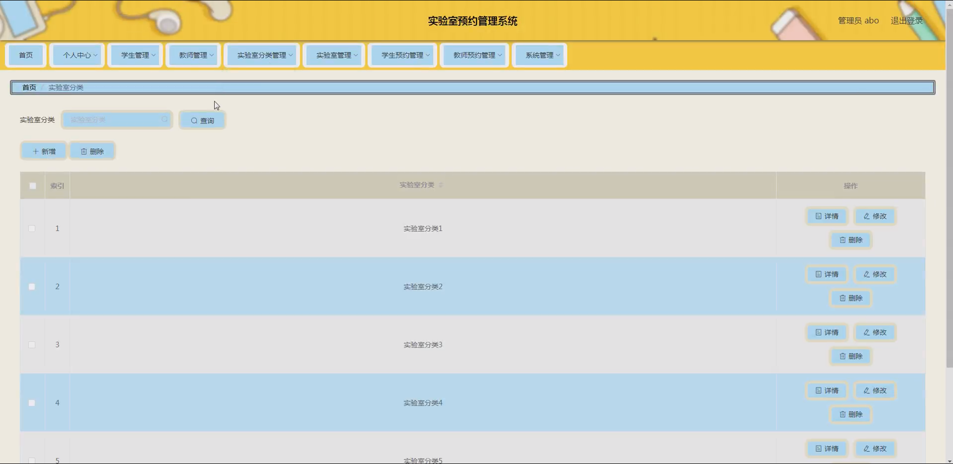 系统项目功能:学生,教师,实验室分类,实验室,学生预约,教师预约,学生取消,教师取消