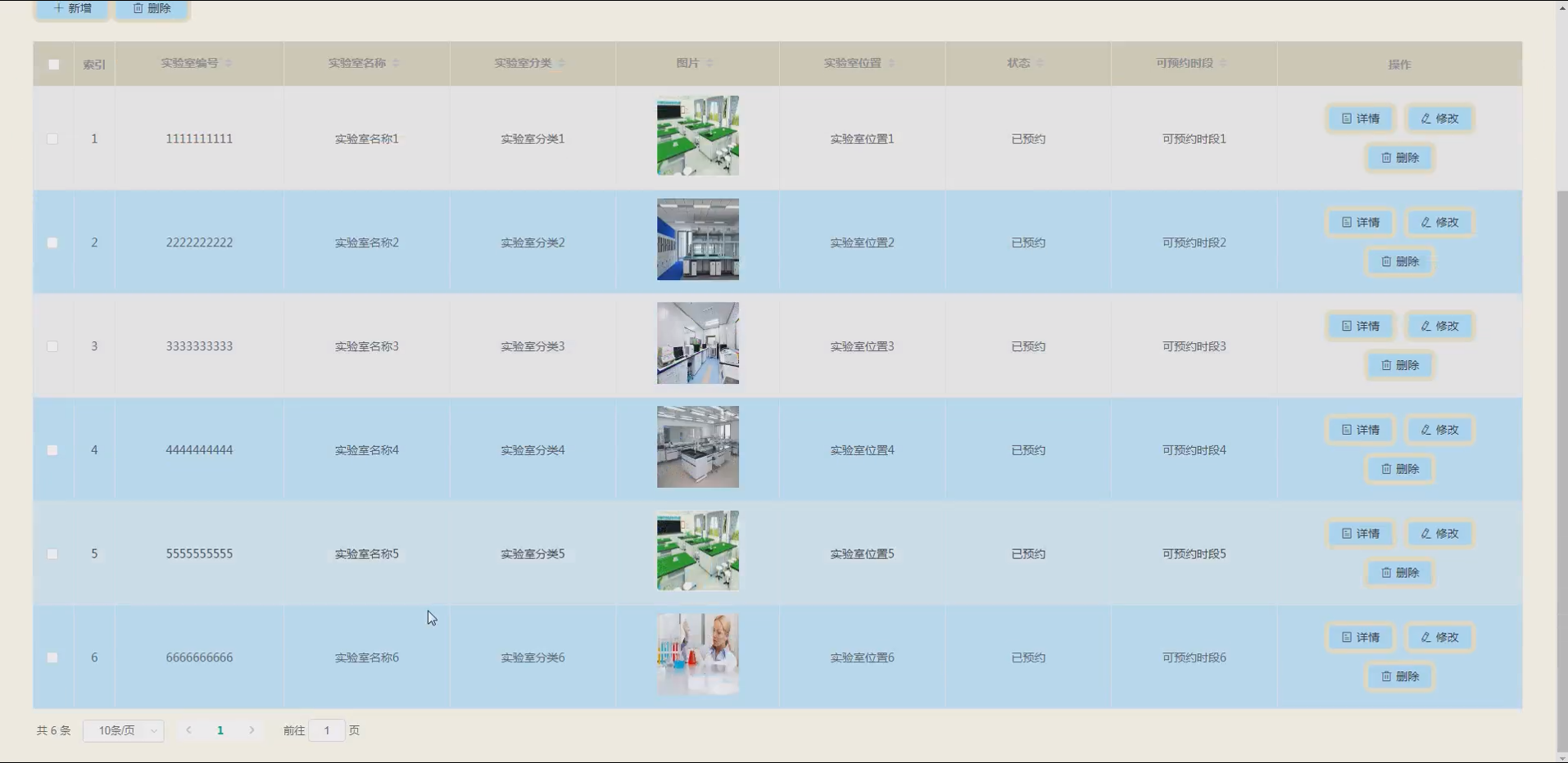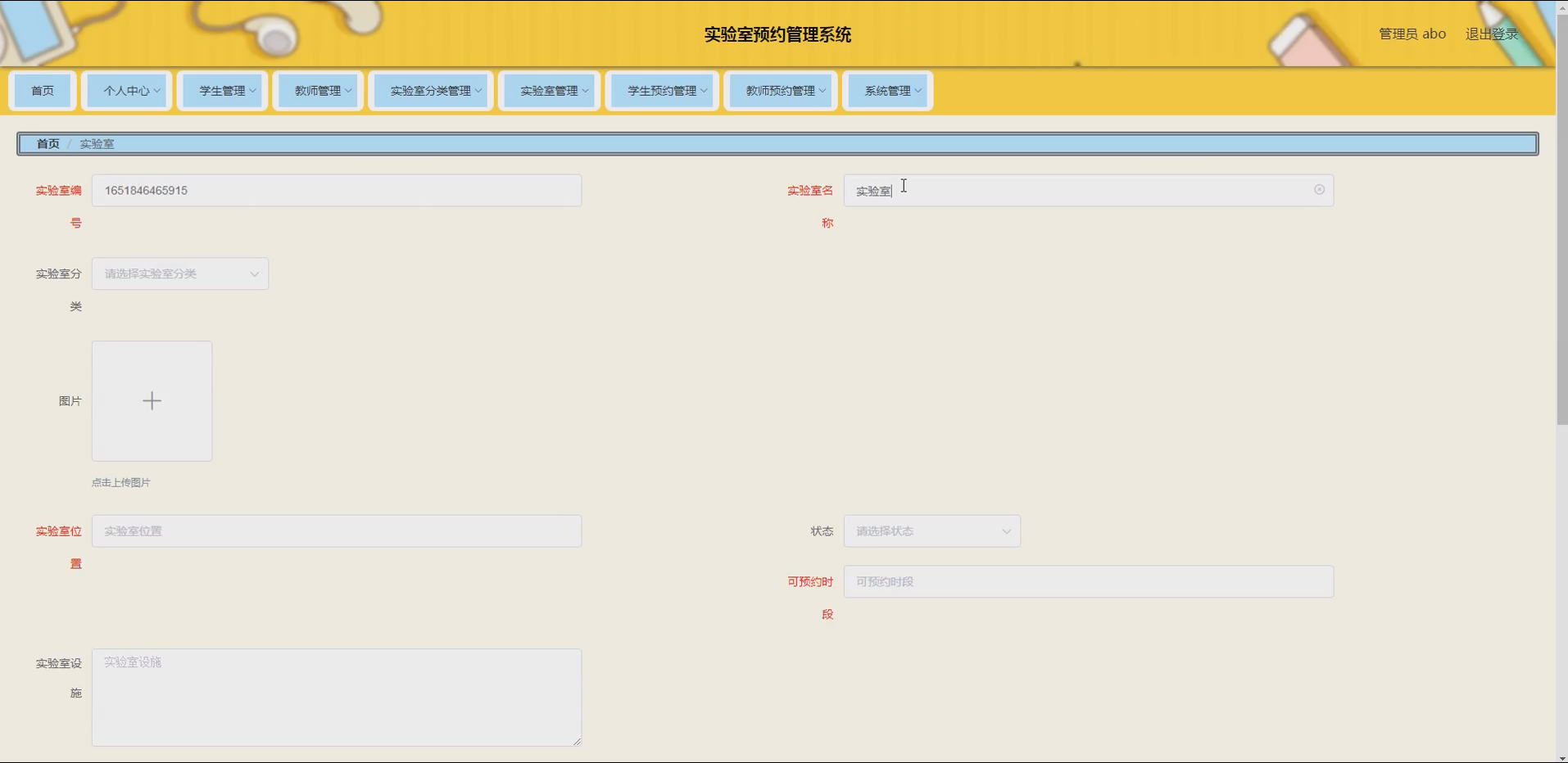 实验室信息管理:管理员可维护实验室的详细信息,包括实验室名称、所属分类、位置、可容纳人数、设备清单、开放时间、当前使用状态(空闲/占用/维护)等,并支持图片上传功能,直观展示实验室环境。同时,管理员可实时更新实验室状态,确保信息同步。