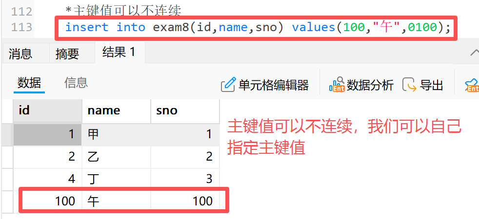**4)**主键值可以不连续,我们可以手动指定主键值,后一个数据的主键会从主键的最大值开始
