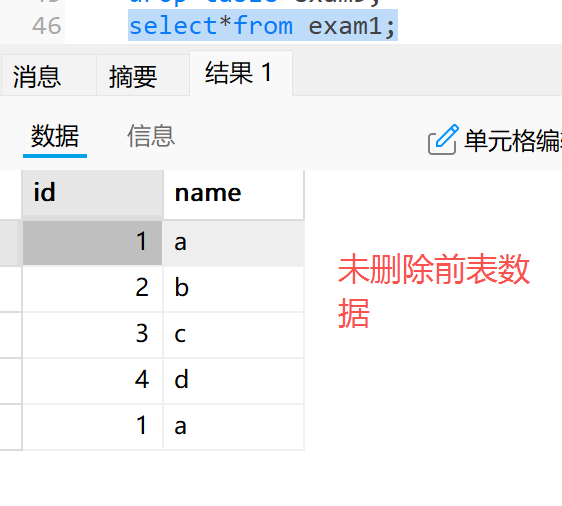 (1,"a"),(2,"b"),(3,"c"),(4,"d"),(1,"a");