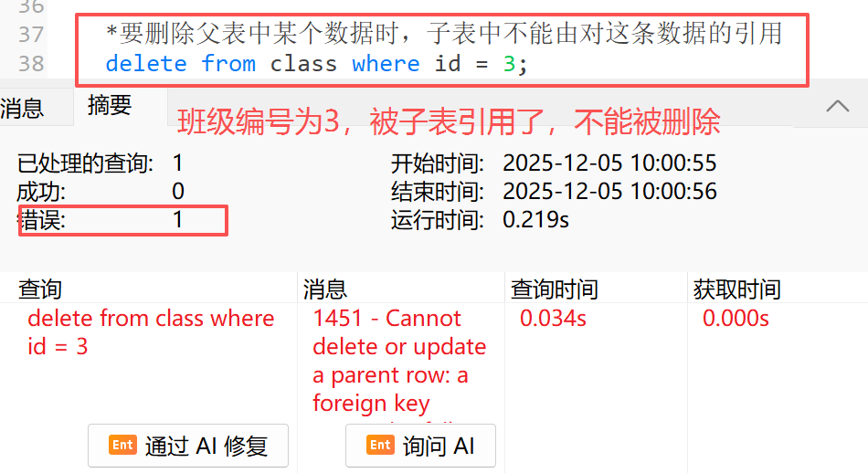 **2)**要删除父表中某个数据时,子表中不能有对这条数据的引用