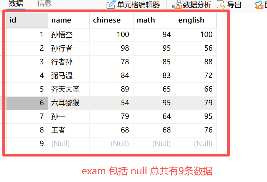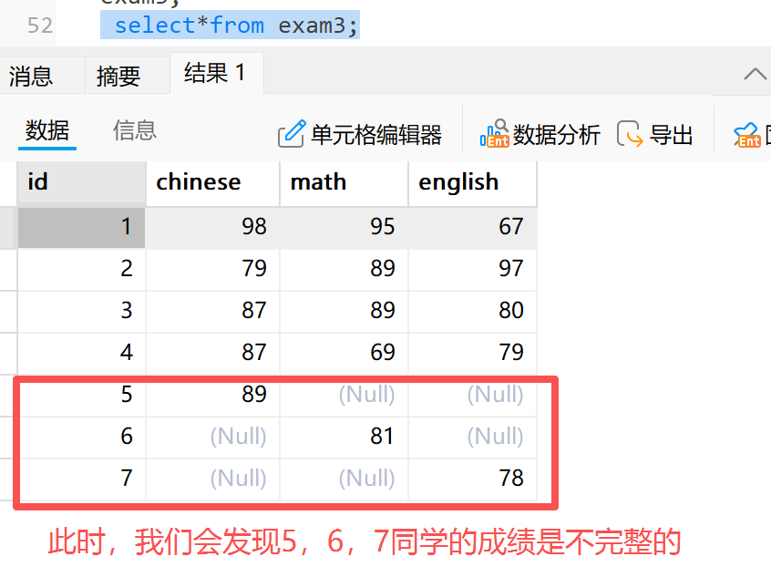 **4.2.2 示例二:**我们现需要统计一些学生的成绩,但有几个学生只有其中一科的成绩