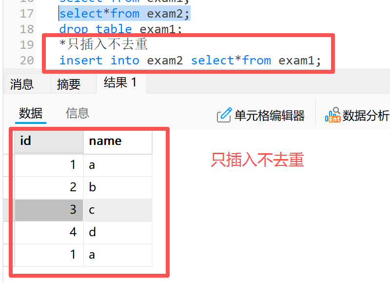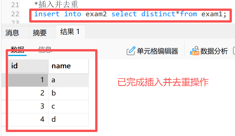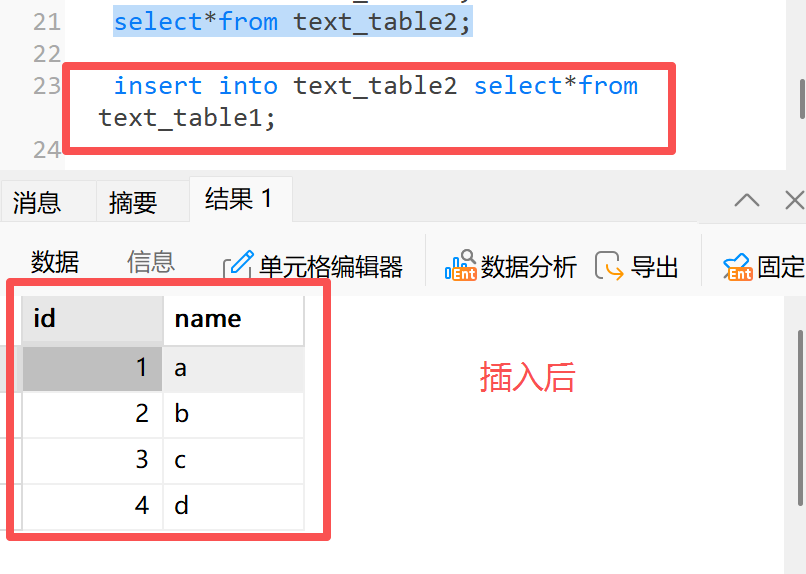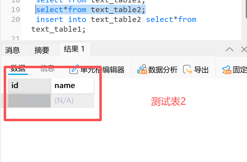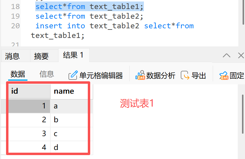 1.2.1 示例一:将测试表 1 中的数据插入到测试表 2 中