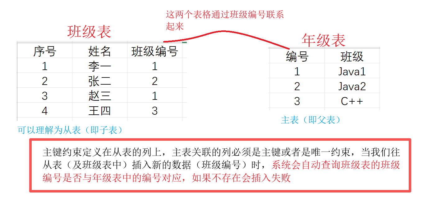 外键约束本质上是用于定义主表和从表的关系(可以简单理解为父子表的关系),我画个图简单理解一下