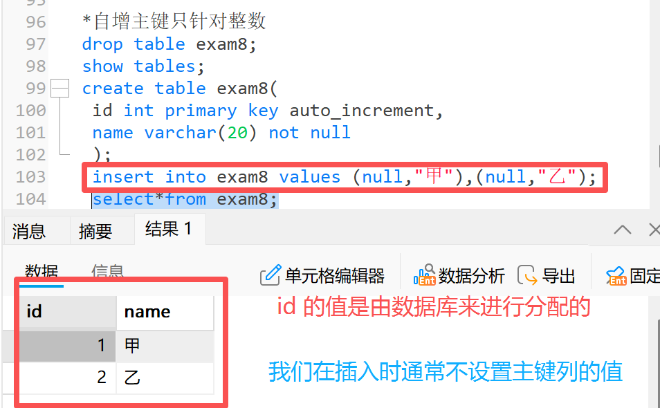 **2)**通常把主键列设置为自动增长,让数据库来维护主键值,插入数据时不设置主键列的值