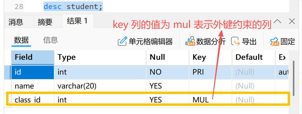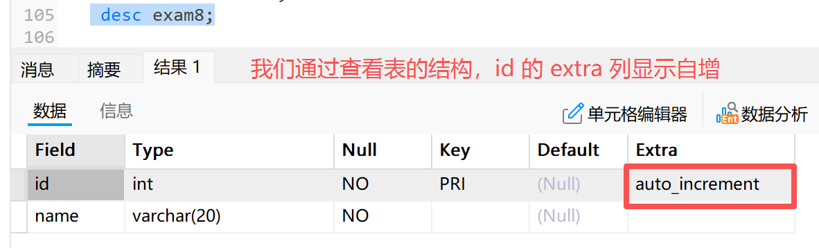 1) 自增主键一般只针对整数,我们可以通过 **desc +**表名,查看表的结构