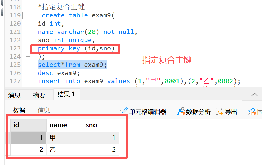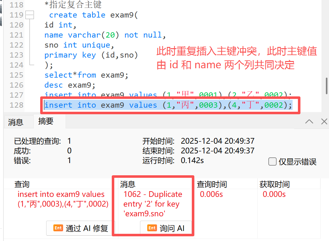 我们刚刚讲到一个表只能有一个主键,但不是只有一个列,我们的复合主键就是有多个列共同组成的主键,主键是否冲突以多个列的组成进行判定的