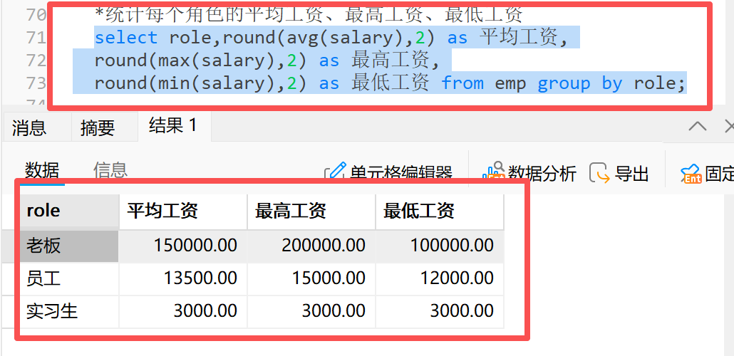 3.1.3 统计每个角色的平均工资、最高工资、最低工资
