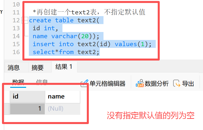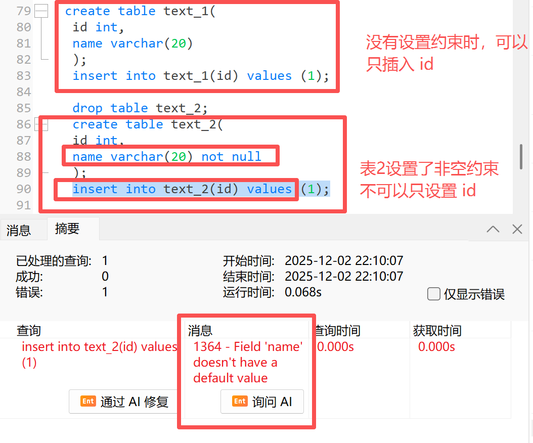 **示例:**我们现在有两个测试表,表 1 没有设置约束,所以我们在插入数据时可以只插入 id ,name 默认为 null ;表2有设置 name 的非空约束, 所以我们在往表 2 插入数据时,就需要保证我们插入的数据的 name 列不能为空,否则会出现报错