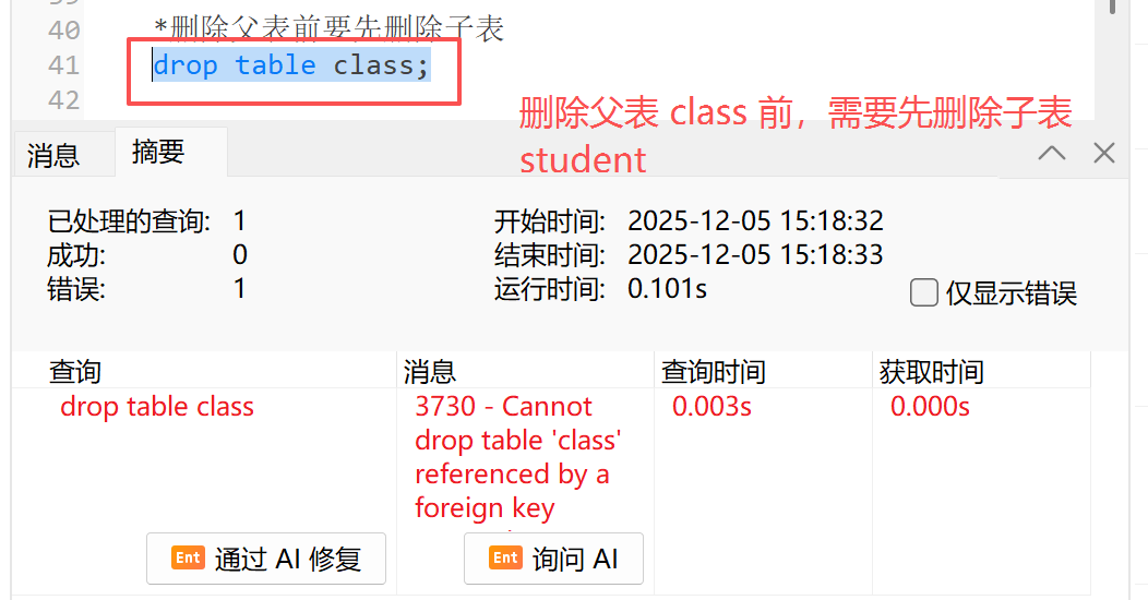 *删除父表前要先删除子表