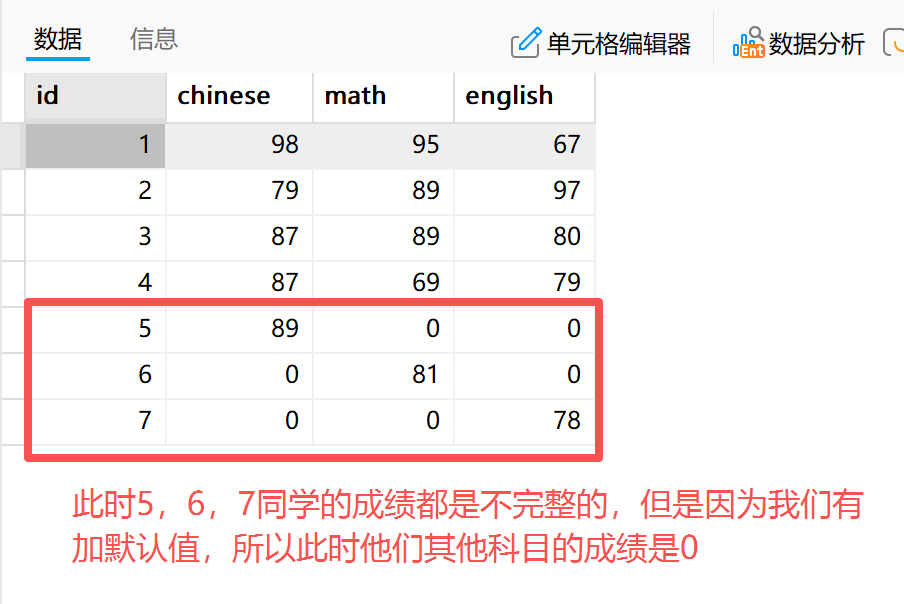 **2)**当我们给表格设置一个成绩默认值为 0 时: