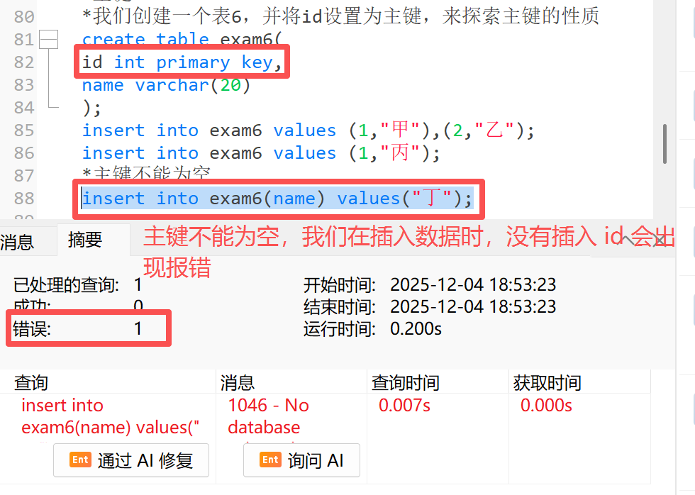 **2)**主键的特点:不能重复 + 不能为空;一个表中只有一个主键(不是说只有一列,我们可以有联合主键)