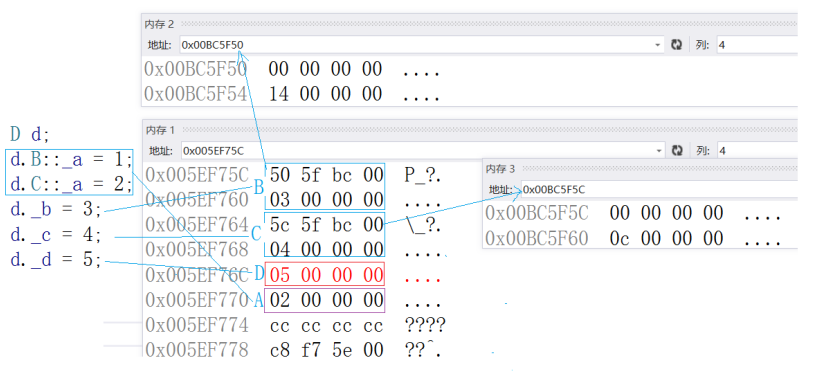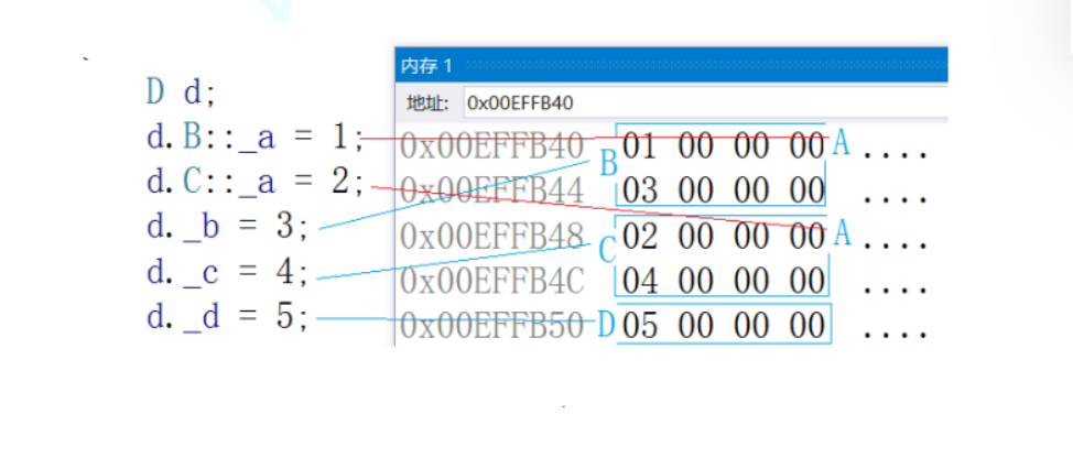 在D类中,A类成员合并为一份,存储在D类的最后面,从而解决了A类成员数据冗余和二义性问题