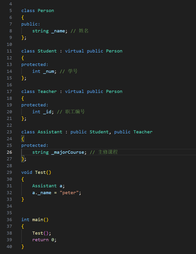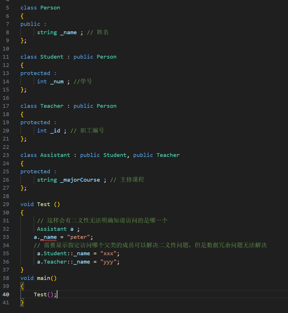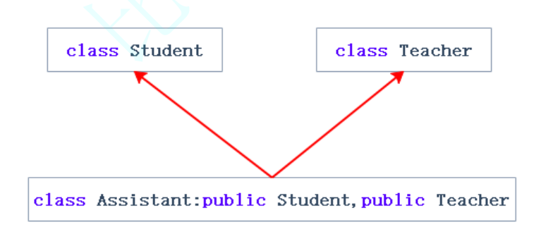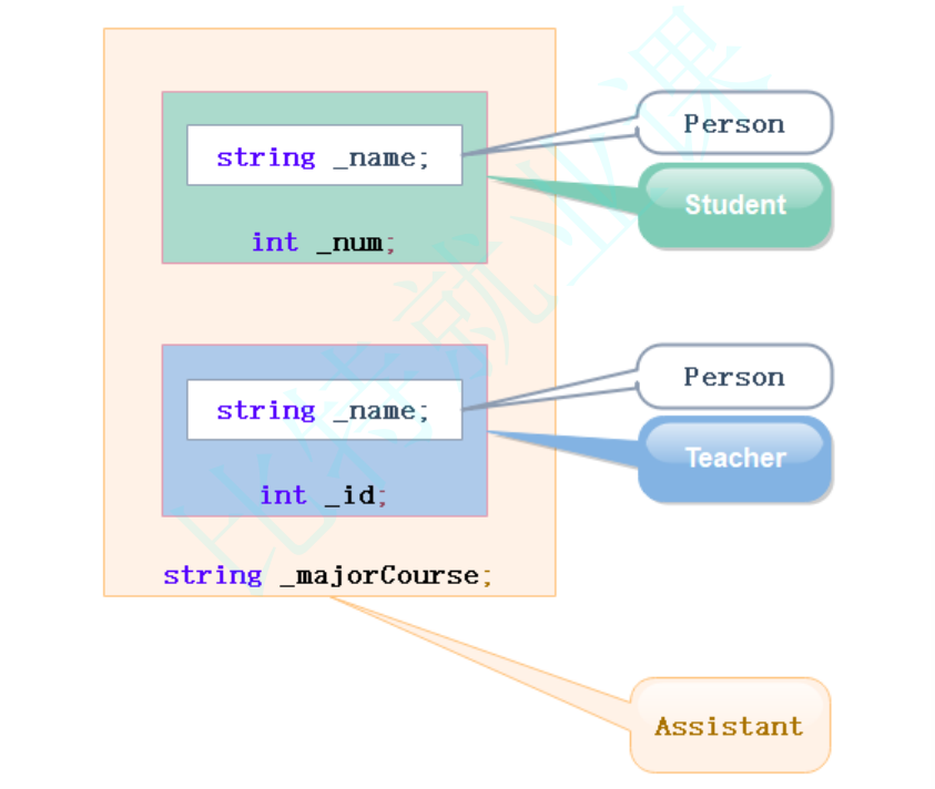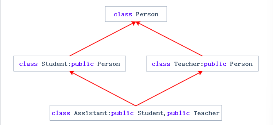 **菱形继承的问题:**根据最下面的类结构模型,可以看出菱形继承有数据冗余和二义性的问题,因为在Assistant的对象中Person的成员会有两份。