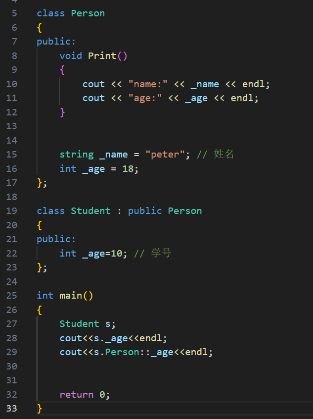 // 继承后父类的Person的成员(成员函数+成员变量)都会变成子类的一部分。这里体现出了