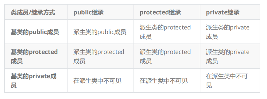 - 实际上面的表格我们进行一下总结会发现,基类的私有成员无论以何种方式继承,在派生类中都是不可见。基类的公有和保护成员在派生类中的访问方式 == Min( 成员在基类的访问限定符,继承方式 ) , public > protected > private。
