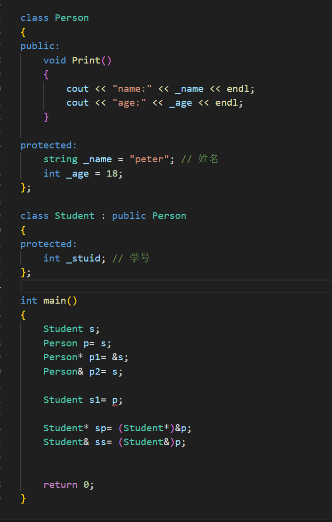 1、派生类对象可以赋值给 基类的对象**/基类的指针/**基类的引用。这里有个形象的说法叫切片或者切割,寓意把派生类中父类那部分切来赋值过去。