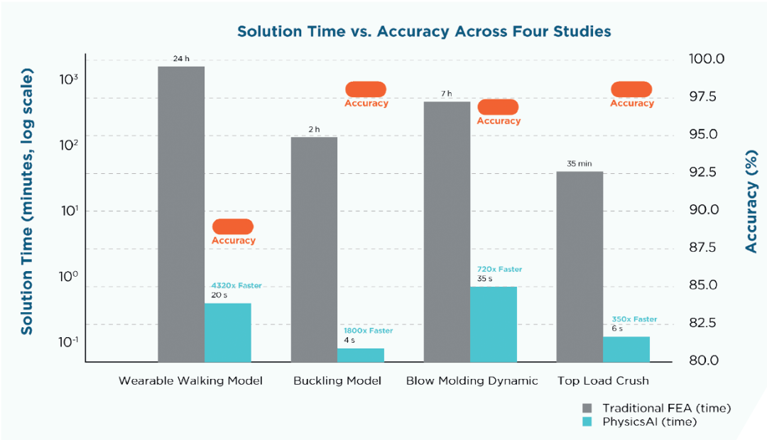 运行于标准 CPU 的 PhysicsAI 模型,其速度比传统有限元分析快 350 倍至 4000 倍 ,同时准确率保持在 87.5% 至 97.5% 之间;