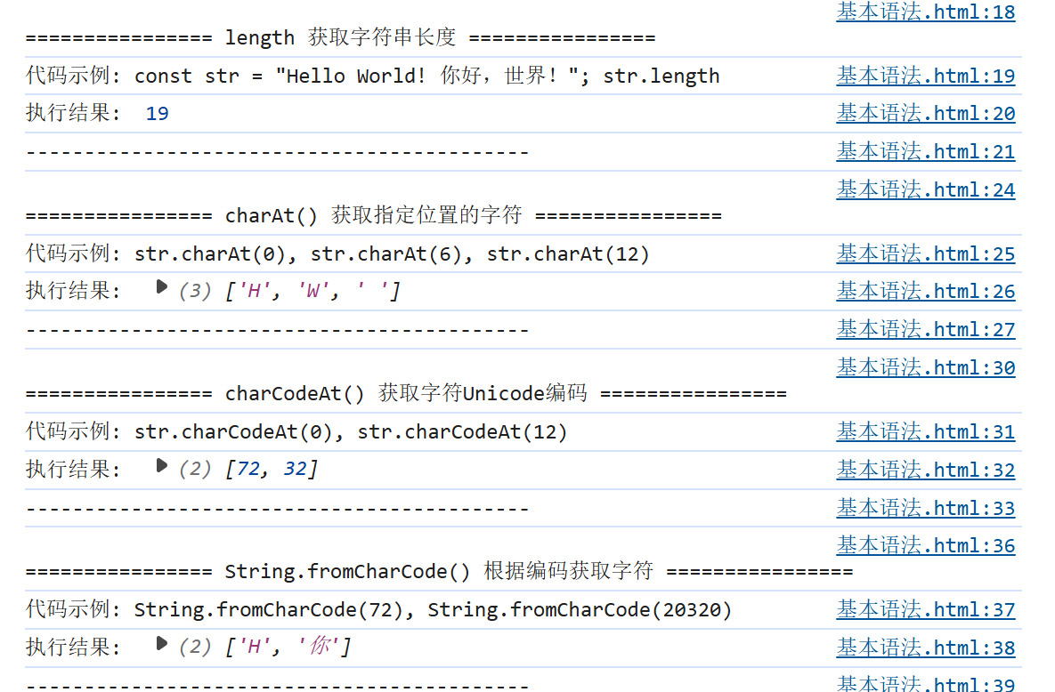 console.log(`\n================ charAt() 获取指定位置的字符 ================`);