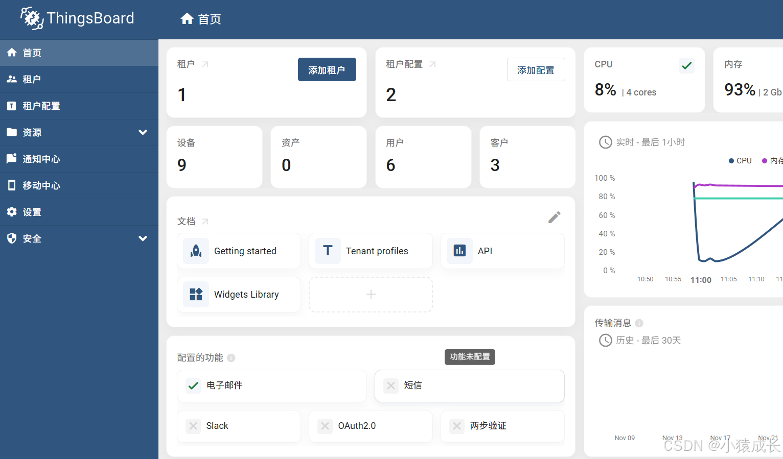 | 租户管理员(TENANT_ADMIN) | tenant@thingsboard.org | tenant | 负责单个租户内的资源管理,比如设备接入、规则配置等 |