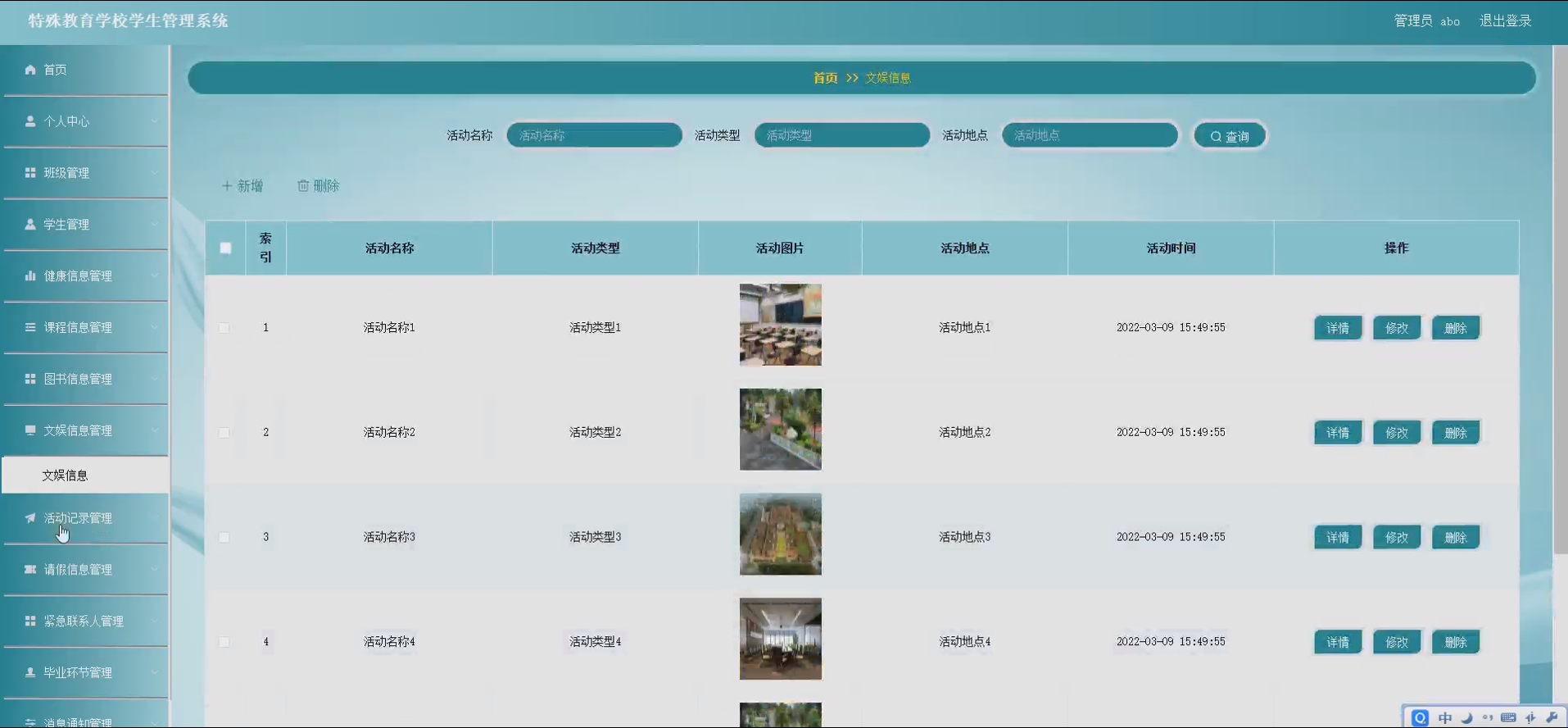 文娱信息管理:记录学校开展的文娱活动信息,包括活动名称、时间、参与学生等,支持活动照片、视频等资料的上传与展示;