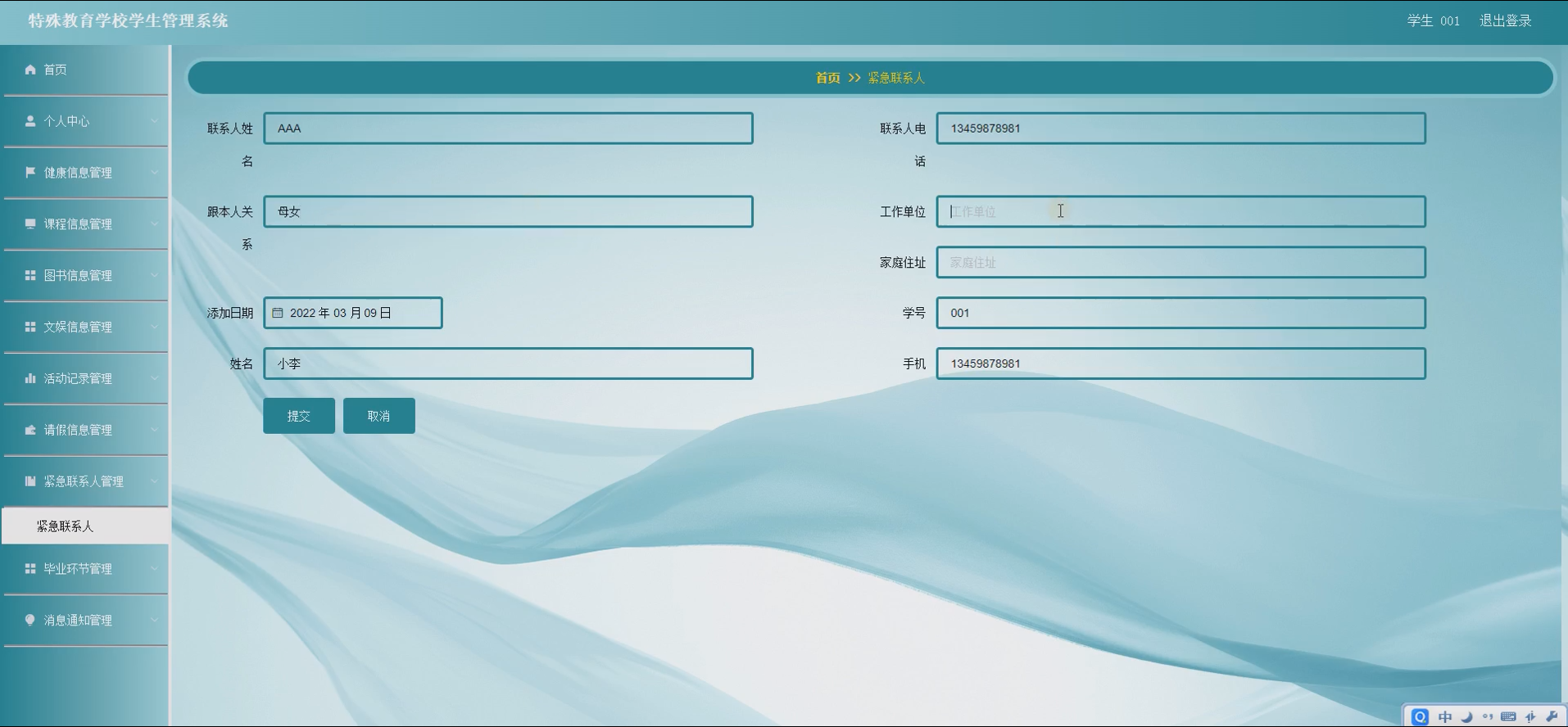 紧急联系人管理:存储学生紧急联系人的姓名、联系方式、与学生关系等信息,确保突发情况下能够及时联系家长;