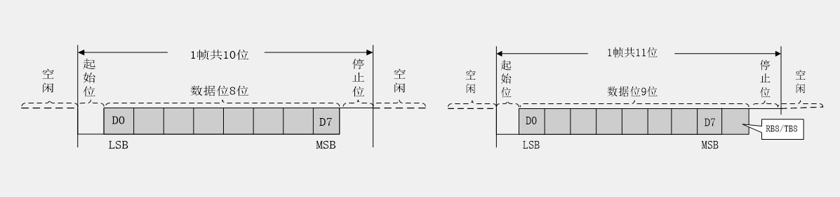 | 数据位 | 0/1电平 | 8位或9位 | 传输有效数据 | 低位(LSB)先发送(如数据0x41=01000001,先传最低位1,最后传最高位0);9位模式下,第9位可作为"地址/数据标识位"(多机通信) |