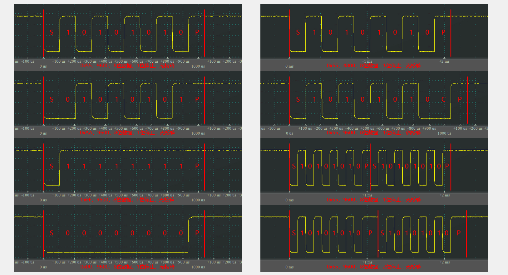 | 停止位 | 高电平(1) | 0.5/1/1.5/2位 | 标识帧结束 | 必须为高电平,是帧的"结束信号";常用1位停止位,2位停止位用于低速/高干扰场景 |