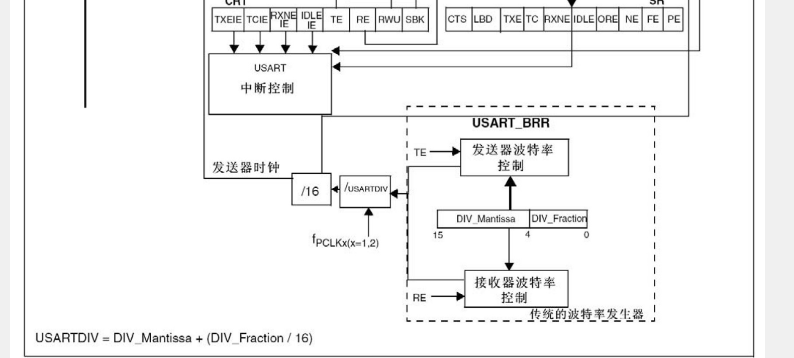 DIV_Mantissa(整数部分)和DIV_Fraction(小数部分)配置波特率,生成发送/接收时钟。 - 控制寄存器(CR1/CR2/CR3):配置工作模式(同步/异步)、中断使能、DMA使能、硬件流控等。