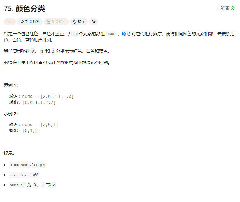 当 nums[ i ] == 2 时,swap(nums[ i ],nums[ -- right] ),注意:这里的 i 是不能 ++ 的,因为当他们交换时,nums[ i ] 是一个未扫描的数字,所以我们要再扫描一次。
