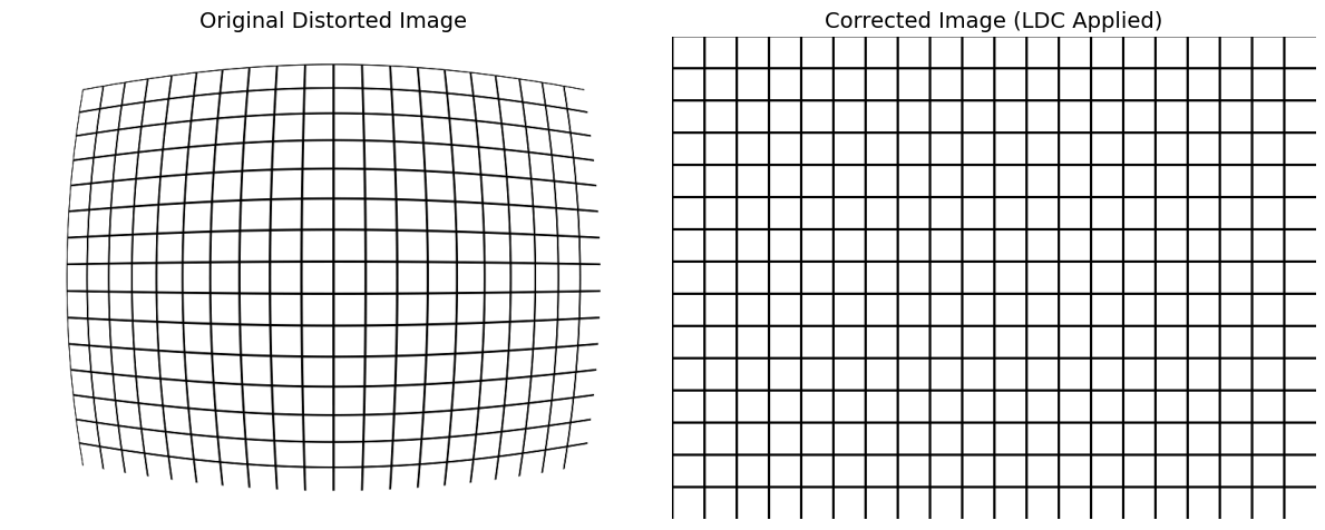 下图展示了强畸变图像经过标定参数矫正后的效果。可以看到,原本弯曲的网格线被拉直,恢复了真实的几何结构。