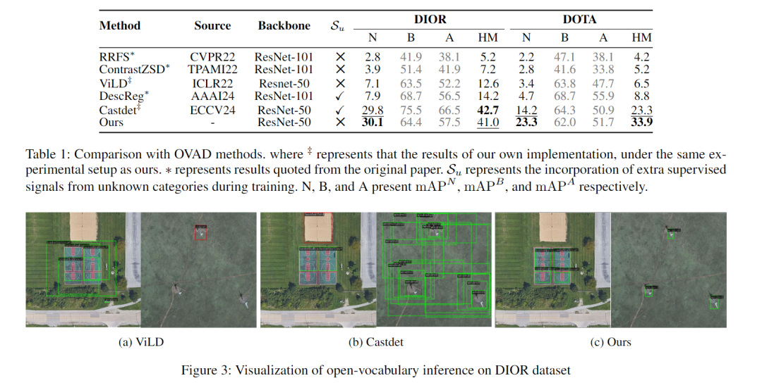 在DIOR数据集上,VK-Det对未知类别的识别精度(mAPᴺ)达到30.1%,比同样"无额外标注"的ViLD模型高23个百分点,甚至比依赖额外标注的CastDet还高0.3个百分点;
