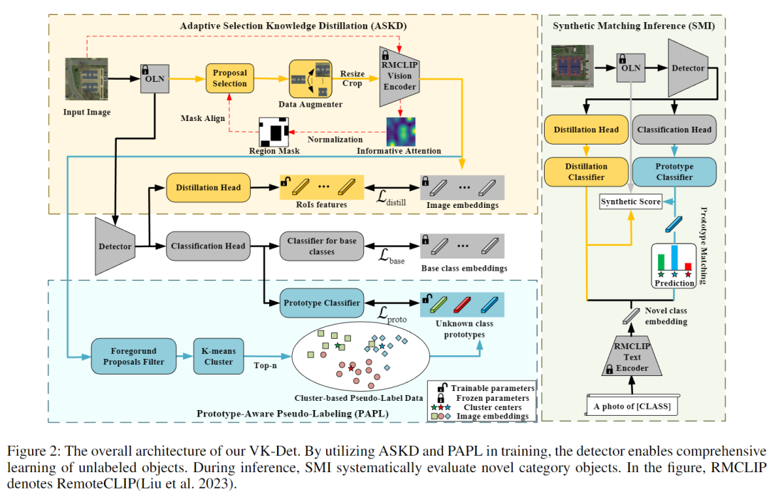 航拍图里常有大片无用背景(比如蓝天、草原),VK-Det发现VLM的视觉编码器能自动"盯着"有物体的区域(比如地面的车辆、建筑)。于是它设计了一个"自适应选择蒸馏(ASKD)"模块: