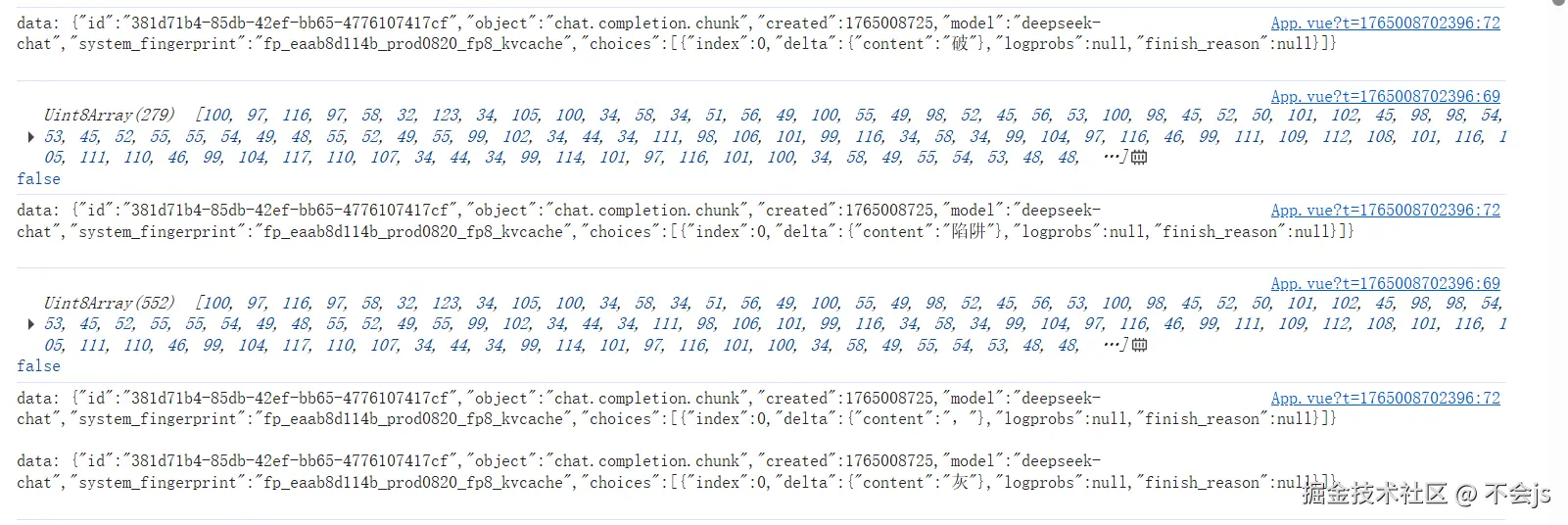 最后成功解析 → 取出 choices[0].delta.content → 追加到 Vue 的 ref → 页面实时刷新 → 流式输出达成!
