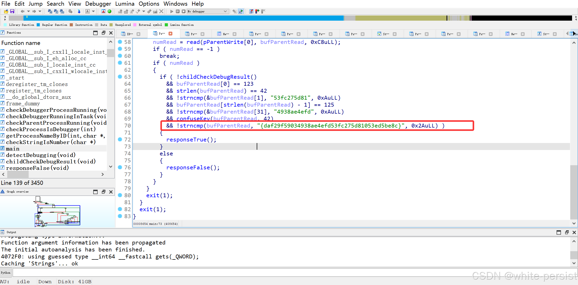 ptrace、checkDebugger等函数时,优先静态分析(无需动态调试),因关键逻辑通常在字符串处理。 - 格式特征利用 :CTF 中 flag 常为固定长度(如 32/42 字符)、含特定符号(如