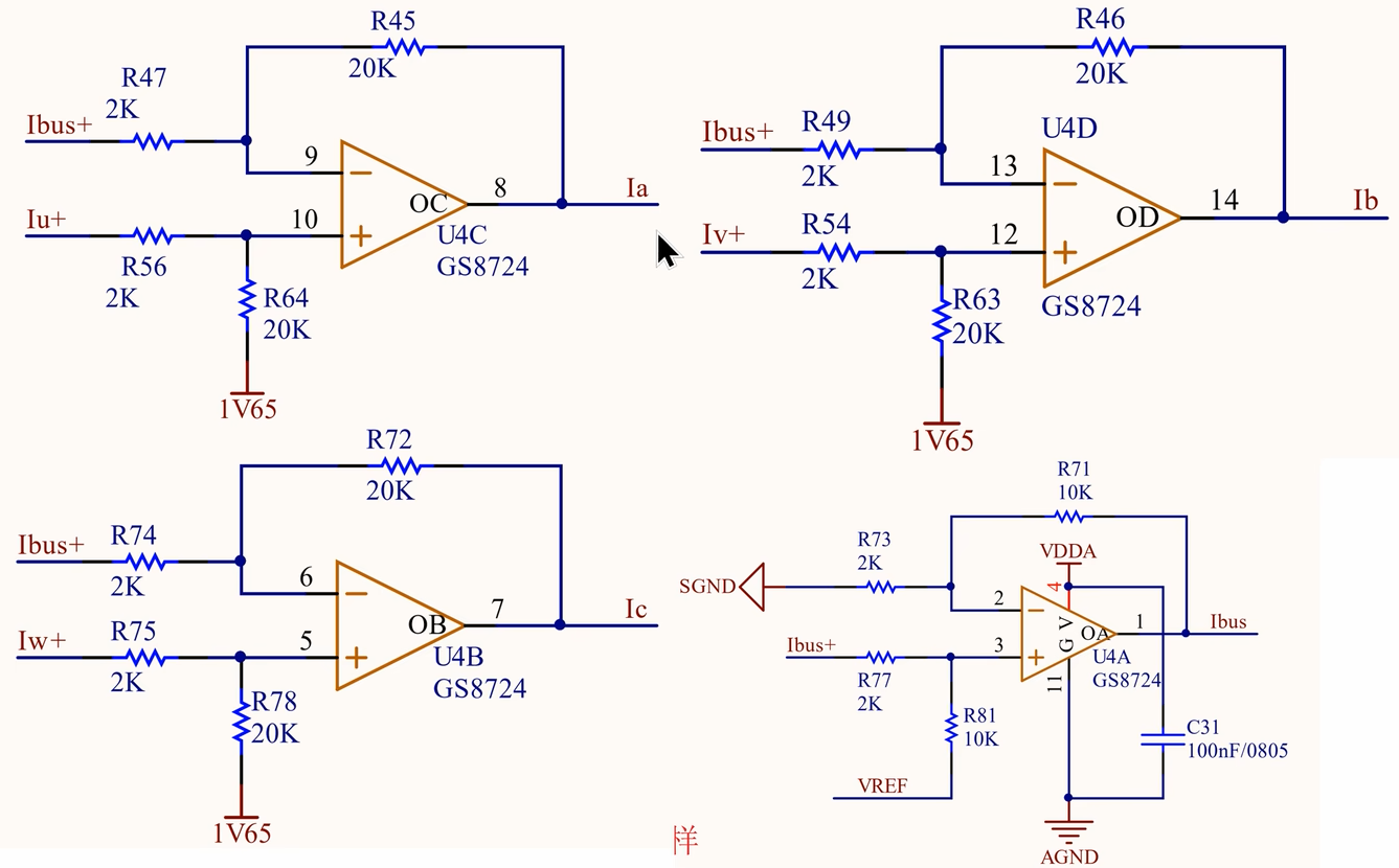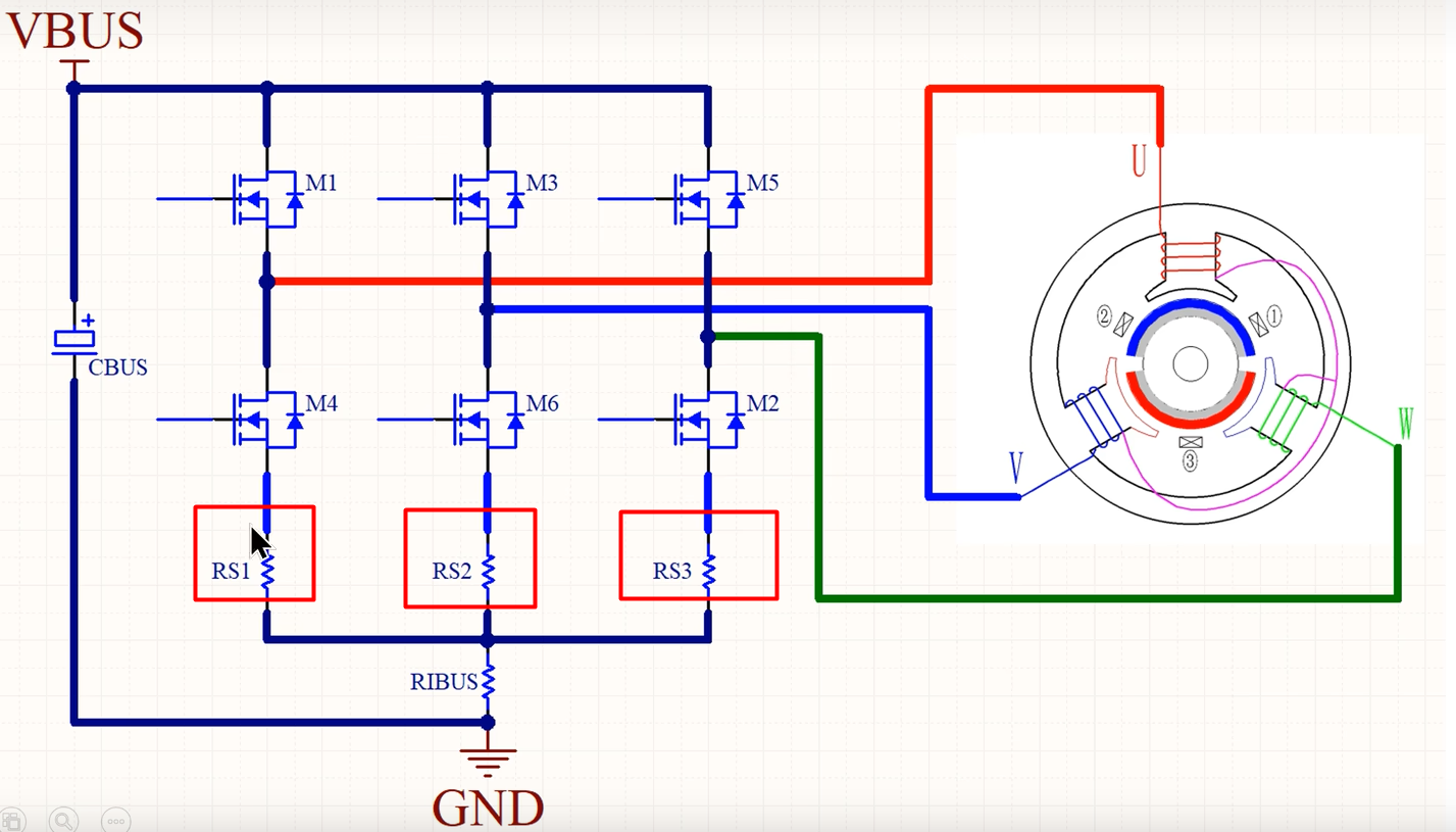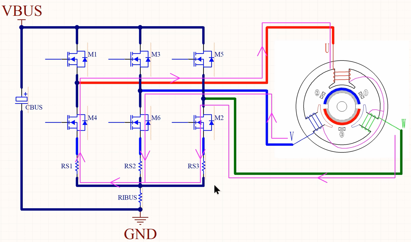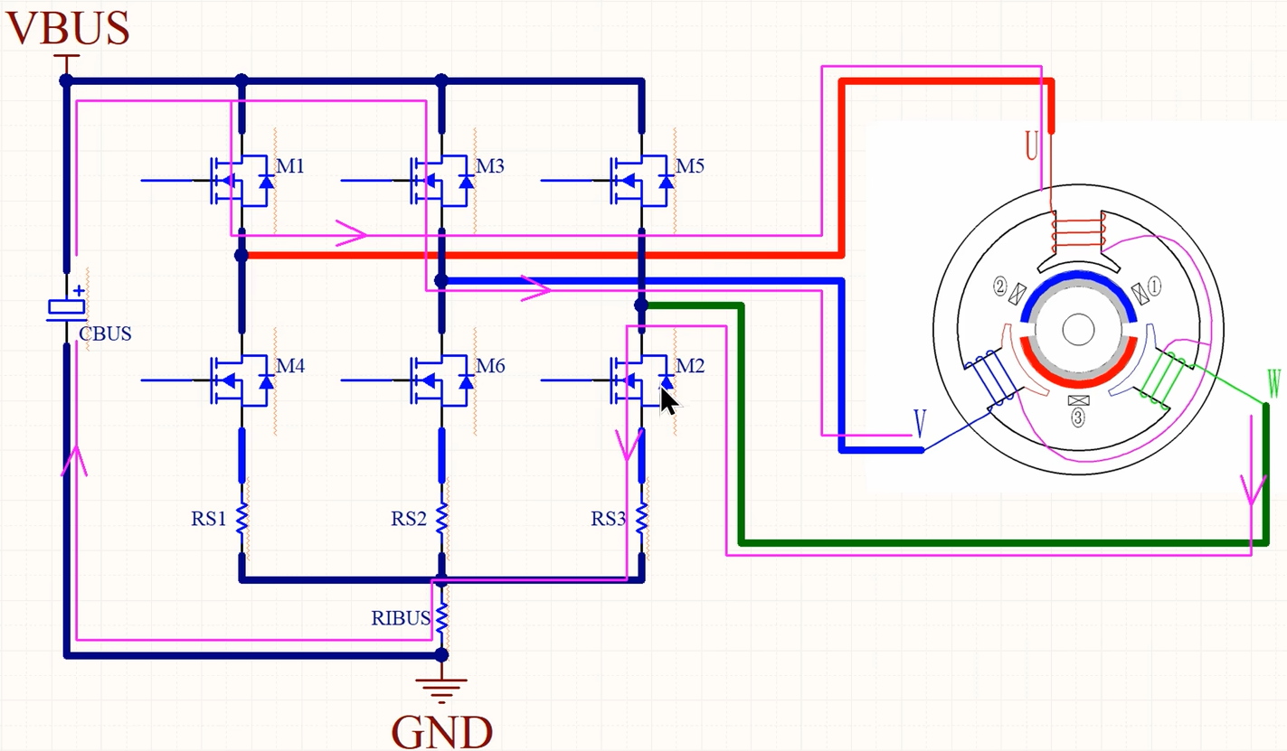 可以采出VW相的电流,推算出U相电流,需注意V1作用时间不能太短,会导致不满足ADC采样时间;