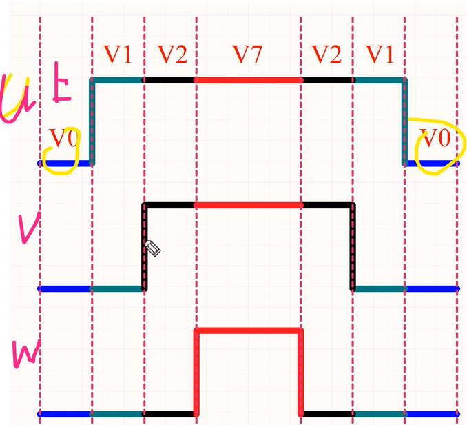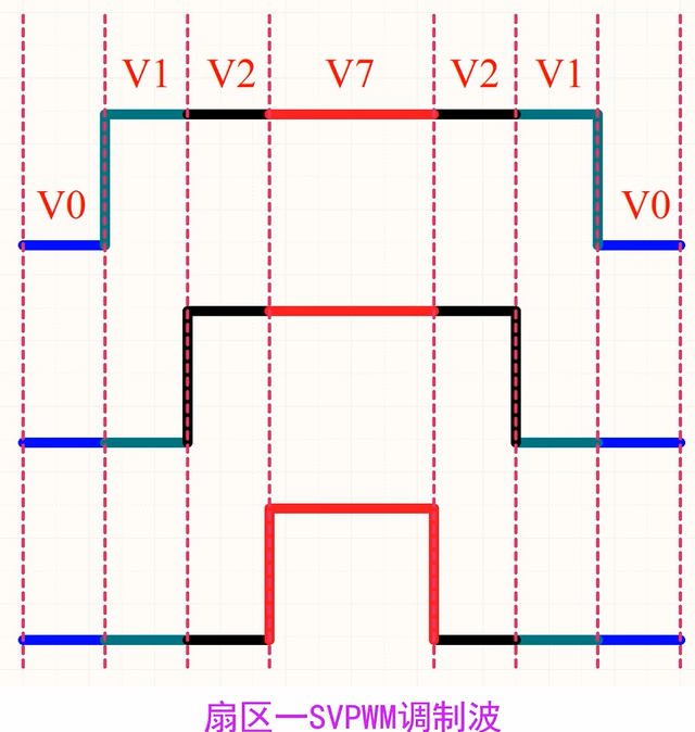 SVPWM各个矢量作用时间是有顺序的,V0时刻就是在V1时刻之后切换到了V0;V1时刻电流经过U相上管,流到V相W相的下管;V0时刻电流继续通过U相下管,流向V相W相的下管,形成续流回路;