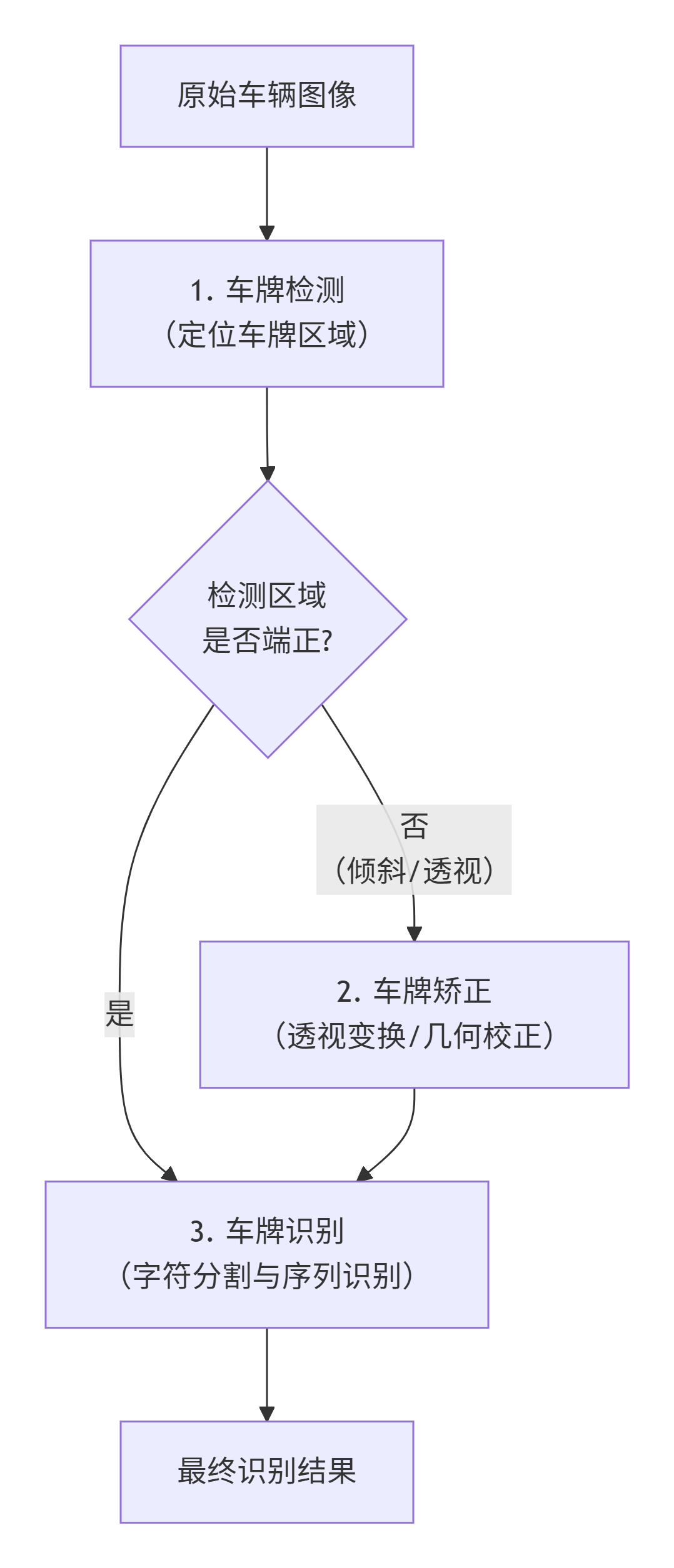 现代车牌识别系统通常遵循一个标准且高效的流程链:首先定位车辆图像中的车牌位置,然后对定位到的倾斜或透视变形的车牌进行几何校正,最后对校正后的车牌图像进行字符识别 。下图清晰地描绘了这一核心流程: