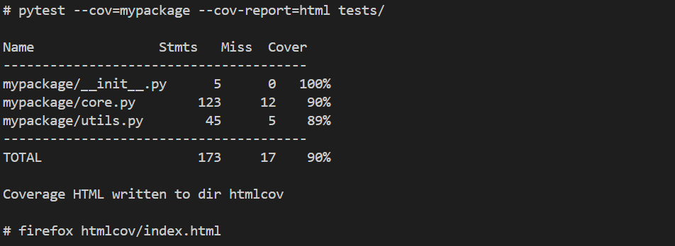 pytest --cov=mypackage --cov-report=html tests/