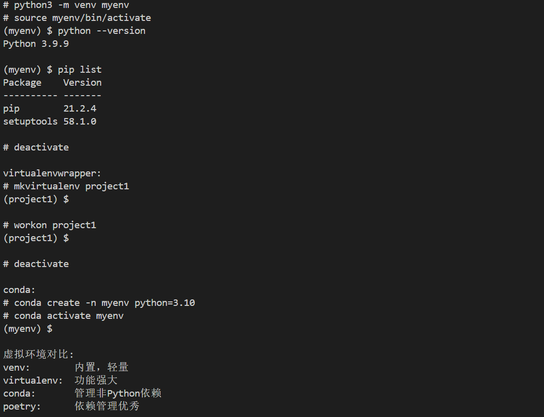 | venv | 内置,轻量 | 功能简单 | 简单项目 |