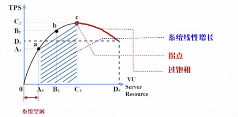 ⑦当并发⽤⼾较少,系统吞吐量低,系统响应时间较短,我们认为系统处于空闲区间。随着系统并发⽤ ⼾增加,系统吞吐量开始呈线性增⻓,系统性能进⼊了线性增⻓区间。