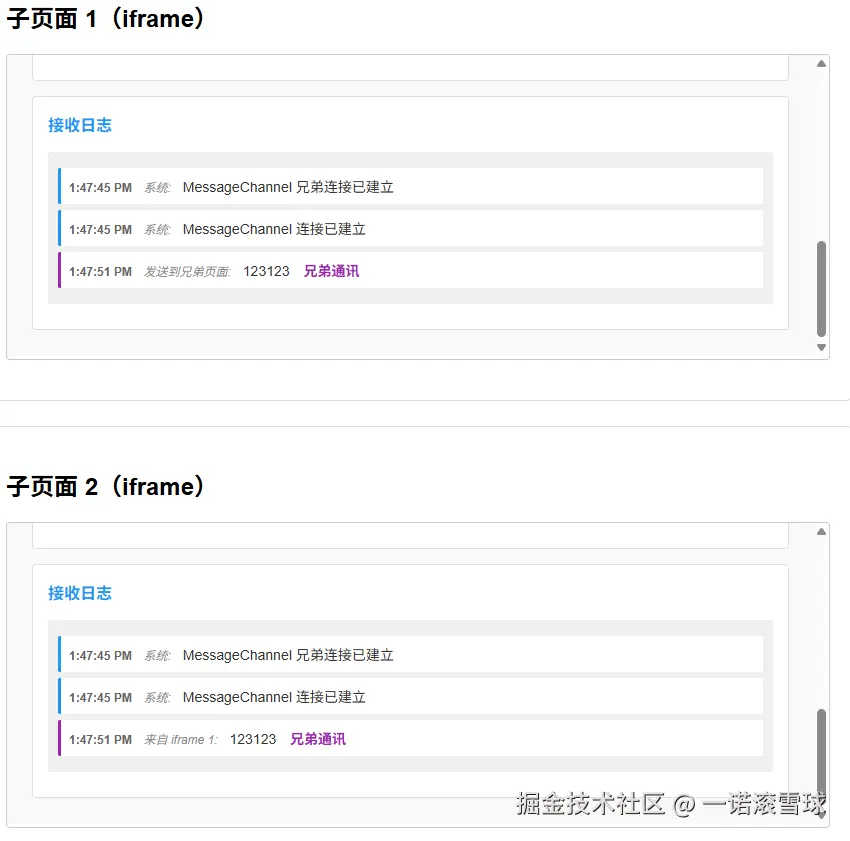 实现思路是: 父页面作为"总机",负责创建 MessageChannel,并将两个端口分别分配给两个 iframe,让它们之间建立起直连专线。