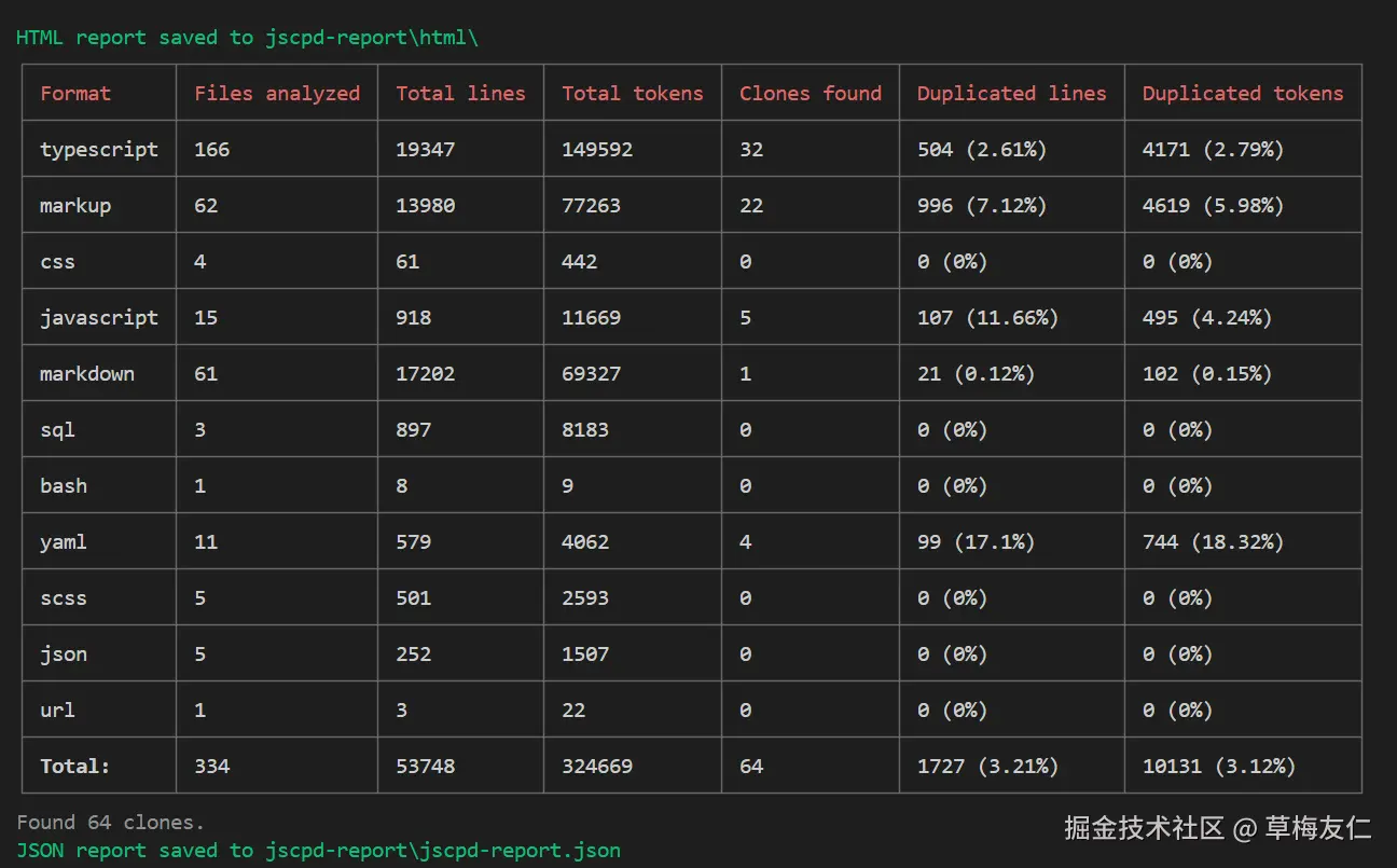 最后是代码重复率,这个由 jscpd 提供,执行 jscpd . 查看当前代码中重复片段的数量。