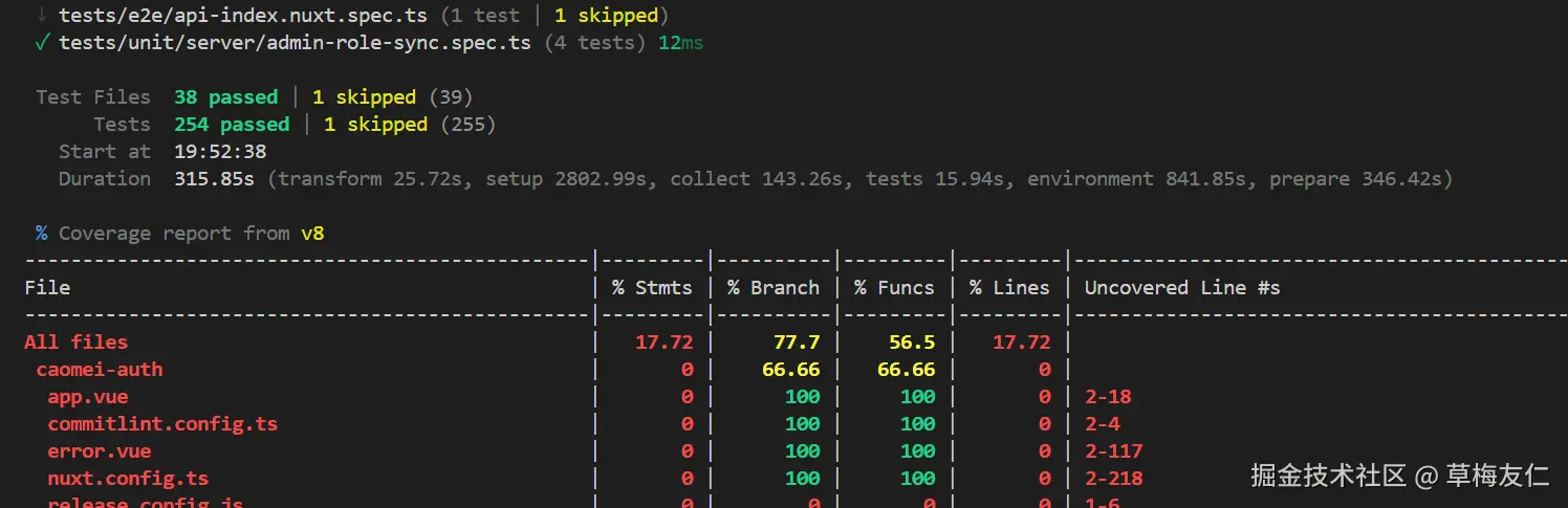 然后是测试覆盖率,这个由 vitest 提供,通过执行 vitest run --coverage 命令即可查看当前测试覆盖率。