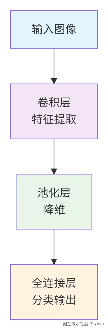 这种经典的"卷积-池化-全连接"结构是CNN的基础范式,ResNet等现代网络在此基础上增加了残差连接、批量归一化等模块来优化深层网络训练。