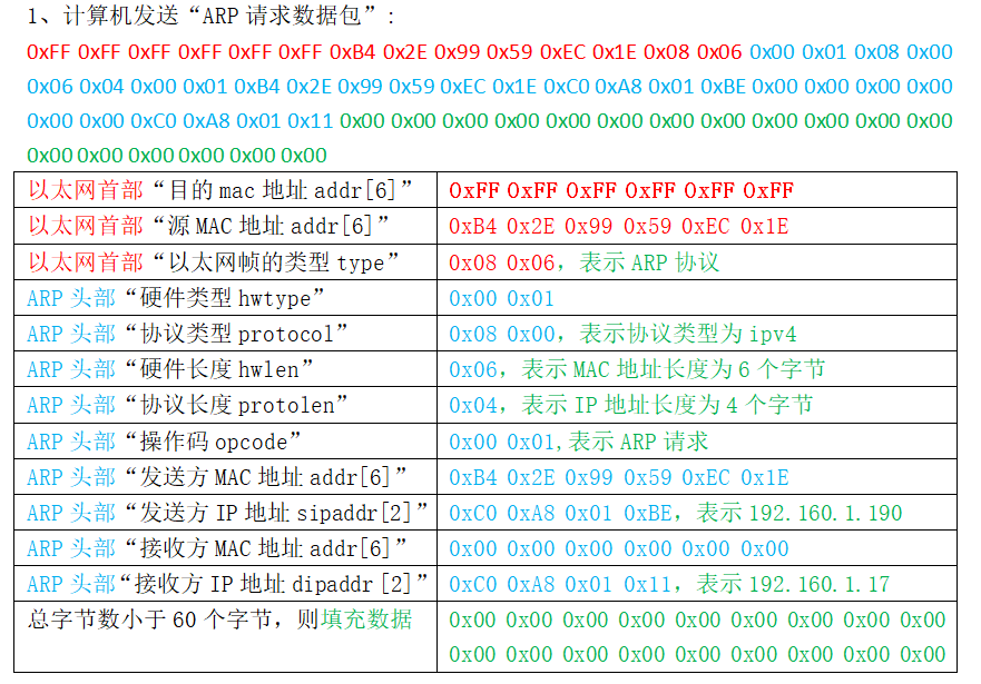 ARP头部数据:0x00 0x01 0x08 0x00 0x06 0x04 0x00 0x01 0xB4 0x2E 0x99 0x59 0xEC 0x1E 0xC0 0xA8 0x01 0xBE 0x00 0x00 0x00 0x00 0x00 0x00 0xC0 0xA8 0x01 0x11