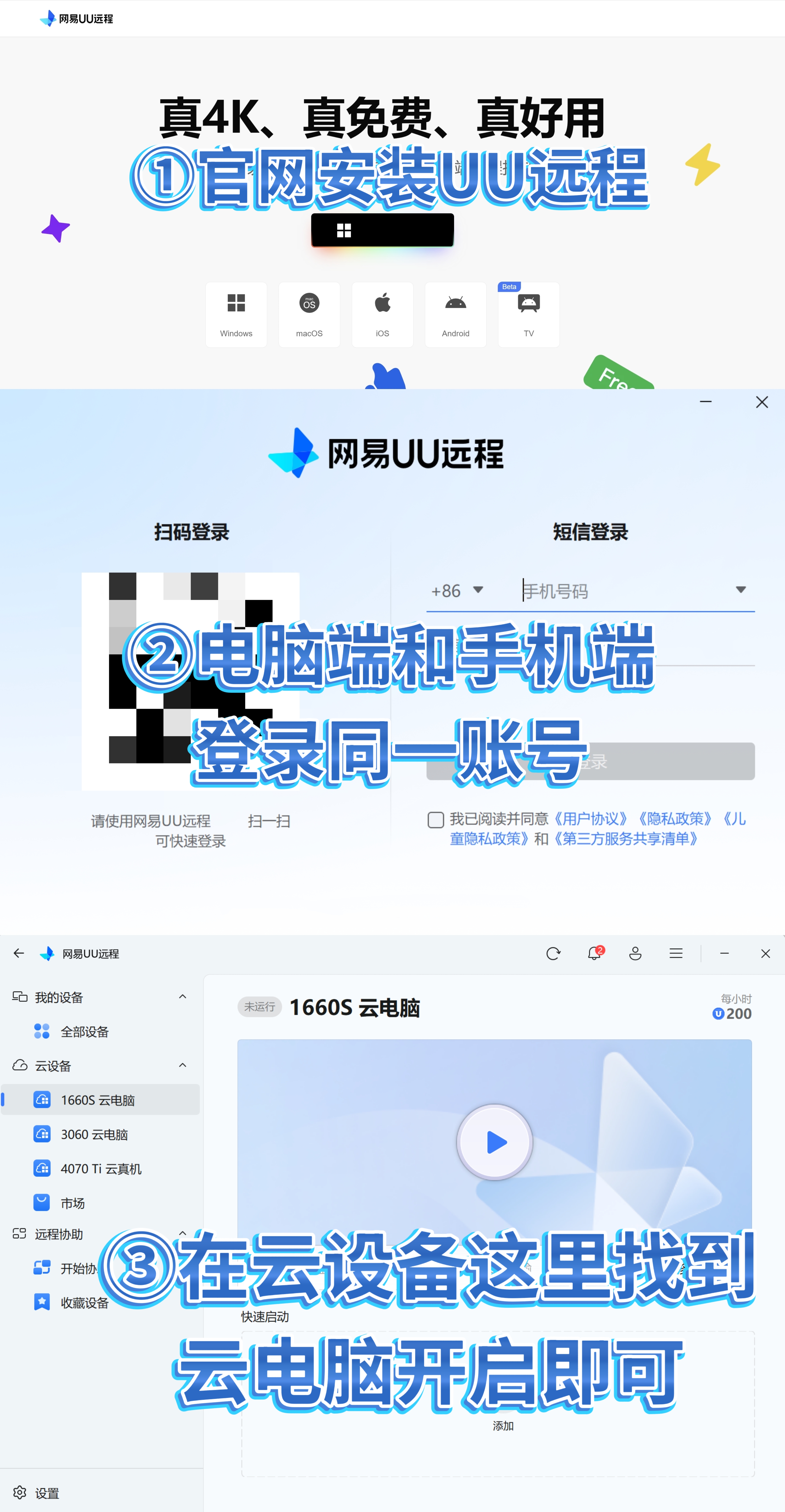 官网安装UU远程,电脑端和手机端登录同一账号,在云设备这里找到云电脑开启即可