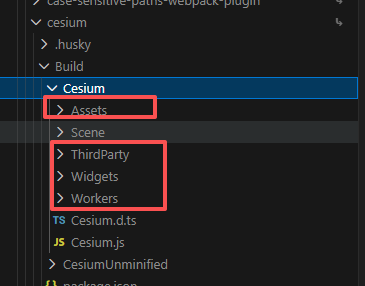 此外,Cesium 还需要一些静态资源文件,比如图片、字体等,这些资源位于 node_modules/cesium/Build/Cesium/ 目录下的四个文件夹中。